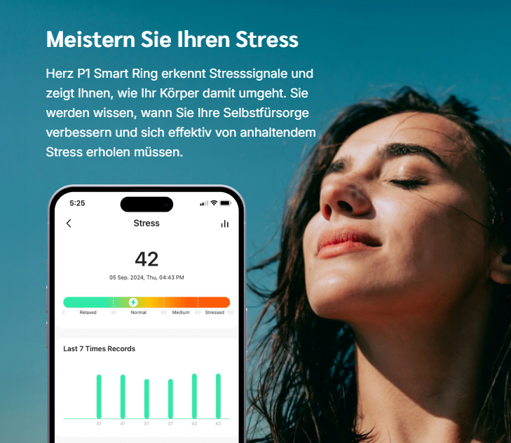 „Ich war ständig erschöpft und wusste nicht warum. Seit ich diesen Ring nutze, weiß ich, dass meine Stresslevel tagsüber stark schwanken. Jetzt kann ich sie beobachten und rechtzeitig entspannen – das hat echt den Unterschied gemacht!“